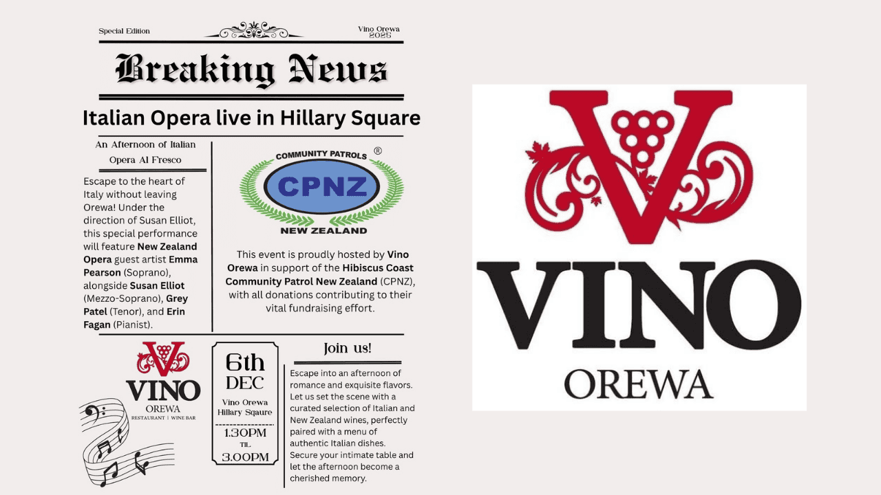 This is more than just an event—it’s for a cause! We are proud to support the Hibiscus Coast Community Patrol New Zealand (CPNZ). Bring the family, settle into the forecourt, and take in the beautiful ambience of Italian opera, courtesy of Vino Orewa. All donations from this event will contribute to their vital work in our community.