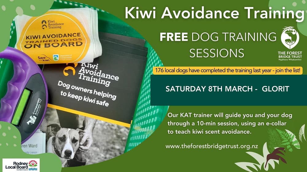 Dog owners in Kaipara please help to protect our growing kiwi populations! If you live or work with a dog in areas known to be home to kiwi, then join us at one of our Kiwi Avoidance Training sessions across Rodney and Kaipara in March.