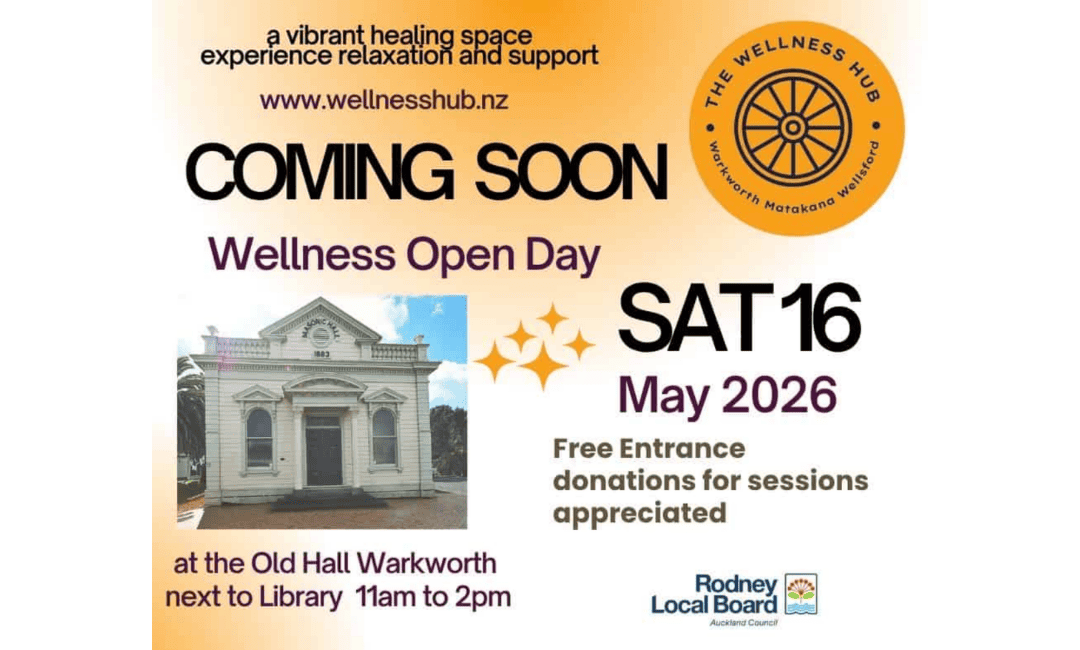 Drop-in to our next Wellness Healing Space at the old Hall next to the library 3 Baxter St Warkworth between 10am and 2pm for health support and emotional support. Relax feel restored centred and lighter.